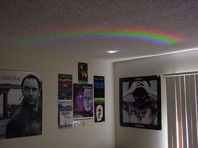 This has to be one of the stranger occurences I've had, but the other morning I woke up, and there was a rainbow on my ceiling above my bed. It was a crazy thing to see right when I opened my eyes. Unfortunatley I looked all over my room, but no pot of gold